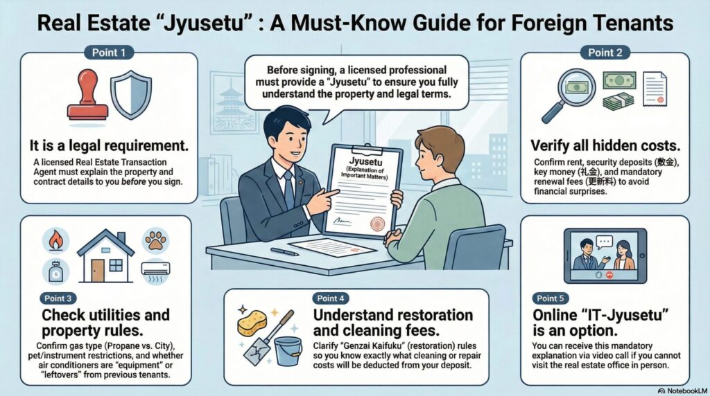 If you do not fully understand the terms during Jusetsu, problems may only appear later — when moving out or renewing.