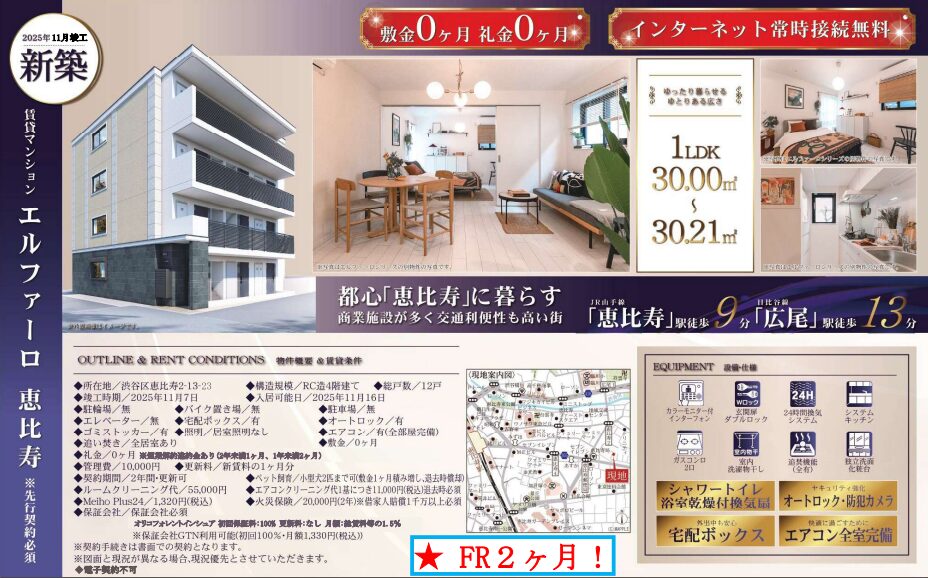 A 9-minute walk from Ebisu Station (Yamanote & Hibiya lines), in a calm yet highly convenient neighborhood near Shibuya.